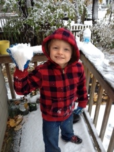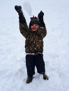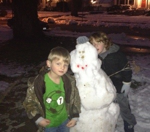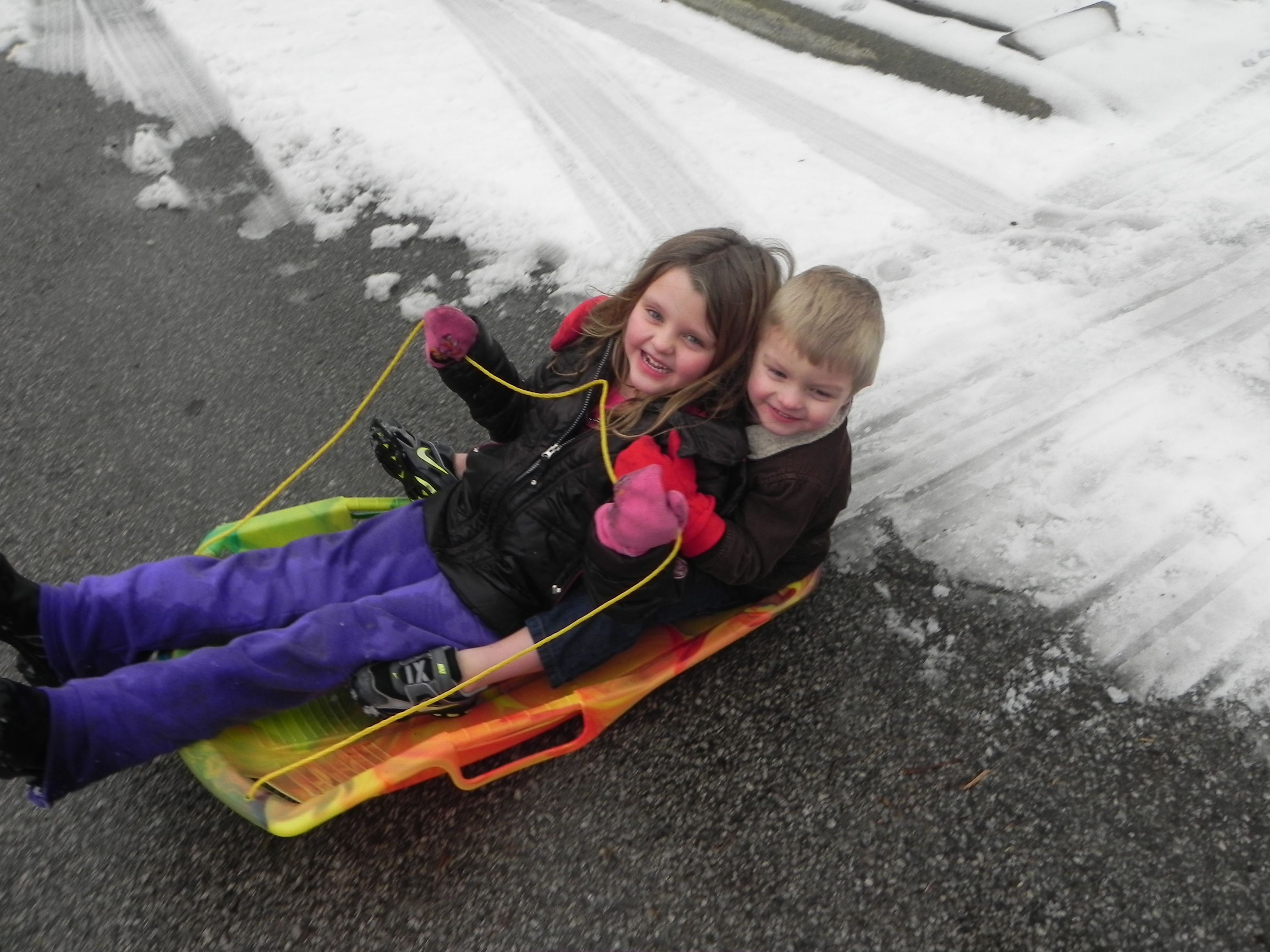 Grandview Grind and he leapt with joy, literally, throughout the entire walk. We visited Ri’s friend and their new pup and Rocco found a playmate. They played great together. Ri ended up staying at Anna’s house while I walked Rocco home. The neighbors were making a giant snowman in the front yard. I walked in the door and told Mario we had to go sledding. There is a small hill by his school that I knew was open. He shook his head no and told me he didn’t feel like it. I kept prodding him until he finally got on his jeans and sweatshirt. He had to wear his Cabella’s overalls and coat since we don’t have any snow pants that fit him. He was all stressed out about how he would look.
