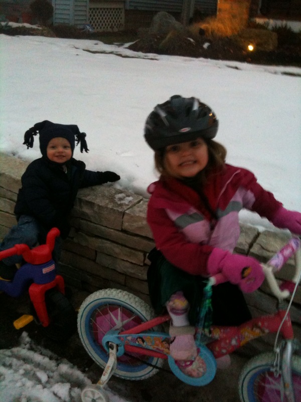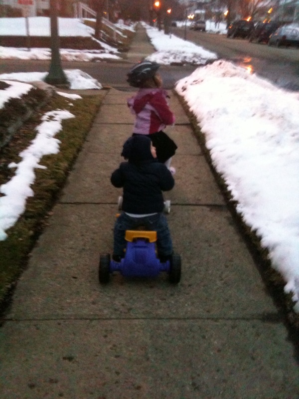 When Maria woke up from her nap at 5 pm, it was still light and a balmy 39 degrees. We threw on our coats and hats and gloves, and headed outside. Half way out the door, Maria remembered that she needed her knee pads and her helmet. I had to give her my bike helmet because she has officially grown out of her Dora one (poor girl has her daddy’s head)! I grabbed Maria’s bike in one hand and Mario’s plastic big wheel in the other. I made sure Maria’s bike was in the front because Maria gets very upset when her brother gets ahead of her; she worries that he will go in the street or hit a pothole. “I need to be the leader so my brother does not get hurt.”