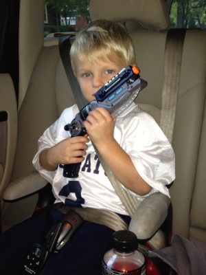 Mario must have heard the last part of Silverman’s video about giving guns to kids because when we went to the car to go get gas he grabbed his gun from the back seat. He shouted “hey mom” to me. “Get a picture of me for that girl, mom!”