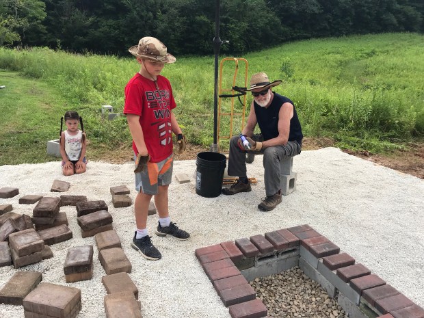It was the nighttime that really got him. He would call us excited during the day and show us the progress he and Peepaw were making on the firepit. He would FaceTime us to show every little detail of what they were doing. The first couple of days he was out there were even more rough because it was a lot of hard labor. They dug holes into the dry land and moved toms of dirt. My dad reported after that the second day was rough for Mario. He took breaks every 30 minutes or so (which, by the way, would probably be what most normal humans do – my dad and I tend to go a mile a minute when we start in on a project), To Mario’s credit, and because I always have to stand up for my man, he did get a major sunburn on his shoulders the day before he went out to the farm. I told him to apply sunscreen but he forgot and spent five hours out in the 90 degree heat at a birthday party. Nonetheless, I’m sure he could have sucked it up a bit more. He knew I was coming out on the third day – Thursday – so on Wednesday I kept reminding him that I would be out in 24 hours. I think this kept him going. When I arrived on Thursday, they had cleared the land and laid the first layer of bricks to the firepit. They needed to lay another four layers of stone. I was eager to help with the work. I love that stuff. If I ever lose my job, I think I will do some type of landscaping or masonry work.